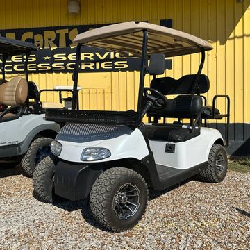 This 2010 EZGO RXV comes equipped with standard AC Brushless Motor and Aut0matic Electronic Parking Brake and accessories include a rear flip seat, custom wheels, and a clay basket.